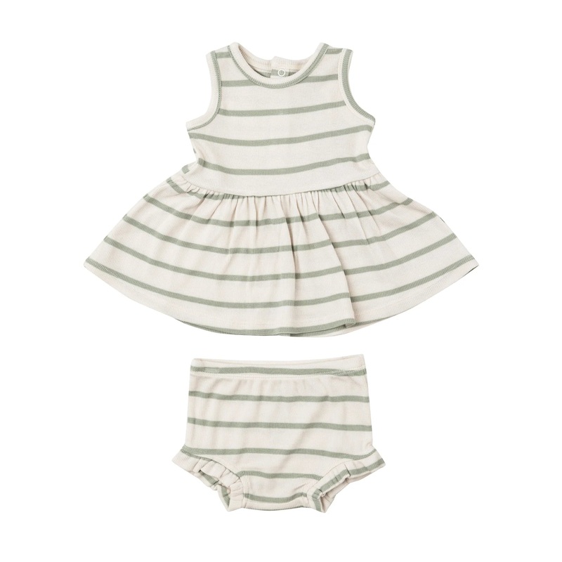 This irresistibly charming set features minimalist stripes adorning the peplum tank and coordinating bloomers. Too cute to resist!