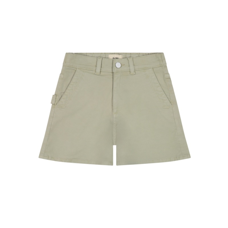 Dried Sage is a muted light green stretch twill. It features white hardware, tonal stitching, and a clean hem.