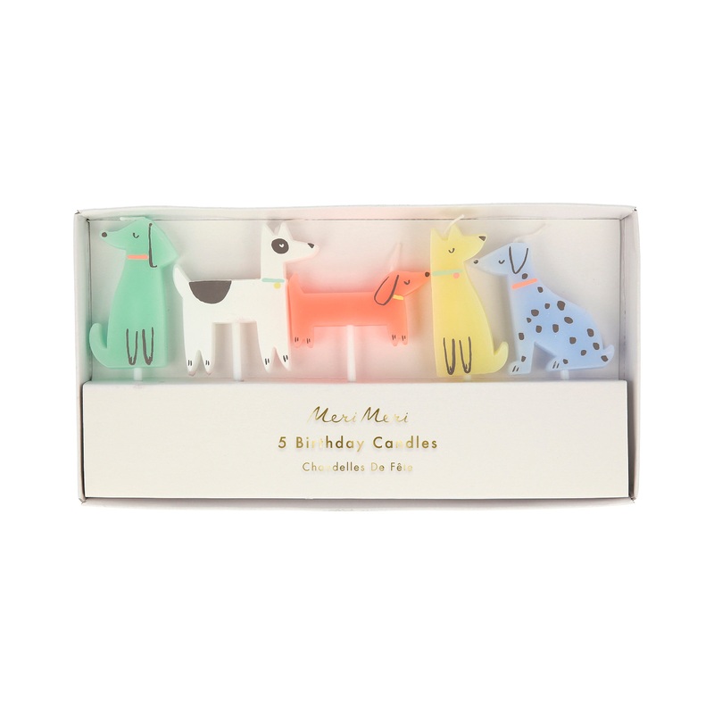 The setincludes 5 dog candles in green, white, neon coral, yellow and blue; each candle measures approx. 1.75″.
