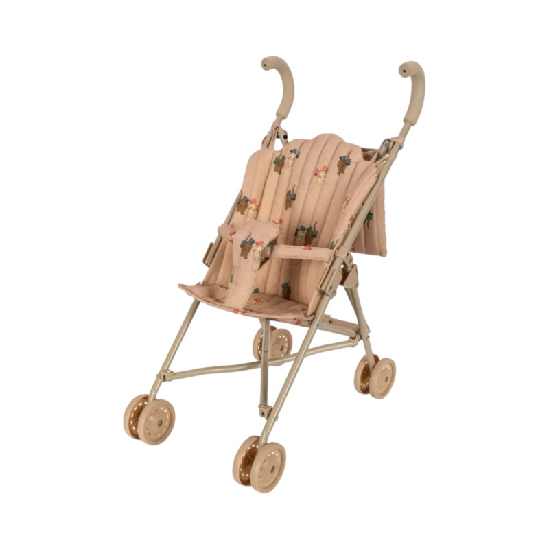 The Doll Stroller Fairy etoile sangriais a stylish and practical pram with harness, bag and double wheels for stability. Fully assembled, easy to fold and store, with an iron frame and soft handles.