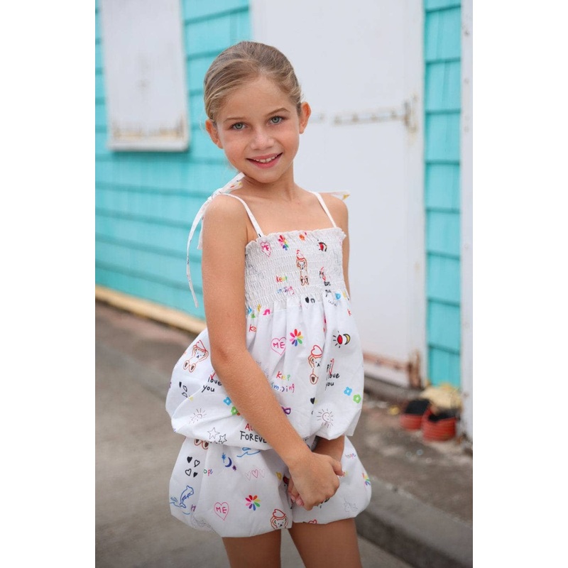 Description:Add a playful touch to your child's wardrobe with this set, featuring whimsical hand-drawn illustrations that capture the fun of carefree days.Designed with an elastic smocked top and adjustable tie straps for a perfect, comfortable fit.cute bu