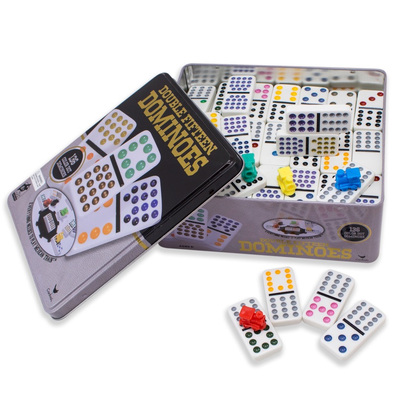 Give a gift the entire family can enjoy! This set of Double Fifteen Dominoes is large enough for up to ten players, and there's enough tiles to play domino games like Mexican train.The Double 15 Dominoes set has one hundred and thirty-six tiles, with color