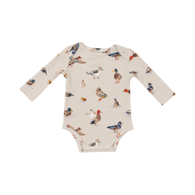 This cozy waffle-knit bodysuit features the cutest little ducks all over and comes with diaper snaps for quick changing perfect for fall.