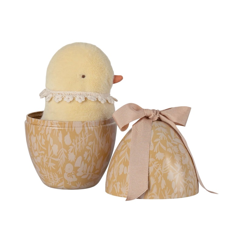 A sweet soft plush chicken with a vintage cotton collar around the neck, packed in a lovely metal egg with a beautiful print and a big soft bow on top – a perfect gift for the small ones.
