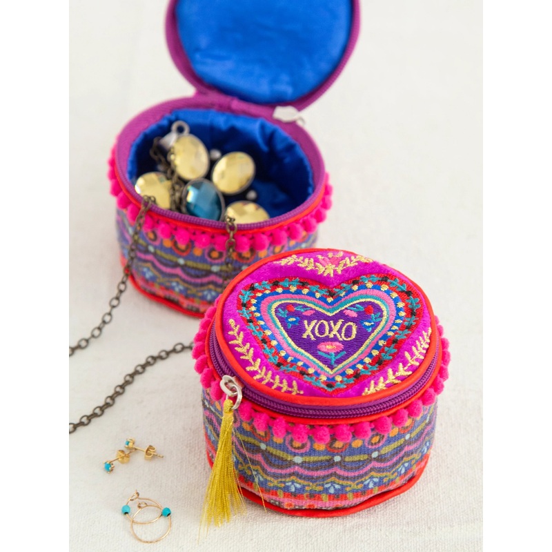 This Travel Jewelry Case makes life a little easier! This case will keep all of your tiniest treasures and accessories safe and intact and fits perfectly inside your bag for easy packing!Features printed corduroy sides, with embroidered tops with gold tins