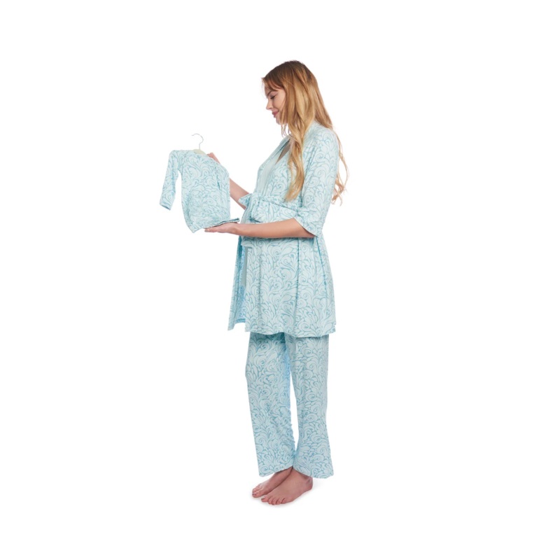 Like mommy, like baby! This soft and stylish 5-piece gift is the perfect sleep and loungewear set for pregnancy, hospital and home. Mom’smaternity/nursing top has cross-over chest that pulls aside for easy nursing, while the pant has a stretchy, smockedwaistband that fits just under the belly. She can throw on the 3/4-sleeve short robe as a stylish cover up when family and friends visit to see the newborn in his/her matching gown and hat! So cute!