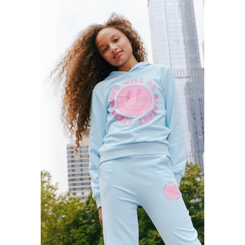Description:Comfortable light blue set featuring a cheerful pink smiley face and an uplifting message.Soft fabric perfect for all-day wear.Includes a hoodie with a front pocket and matching jogger pants with an elastic waistband and cuffs.Perfect for addin