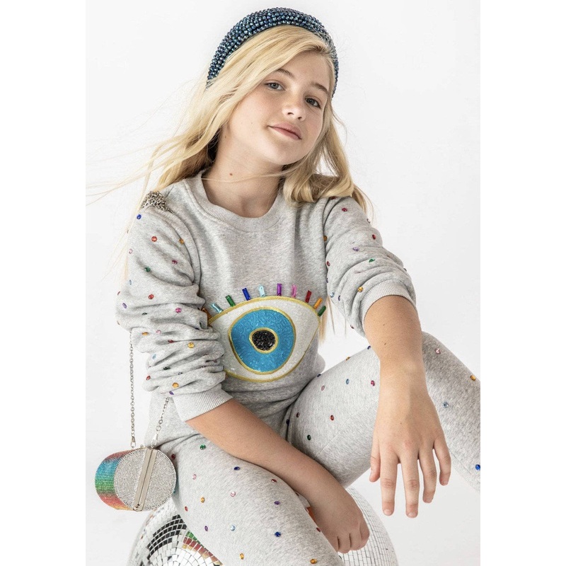 - Sweatshirt features a dazzling evil eye patch with rainbow lash accents.