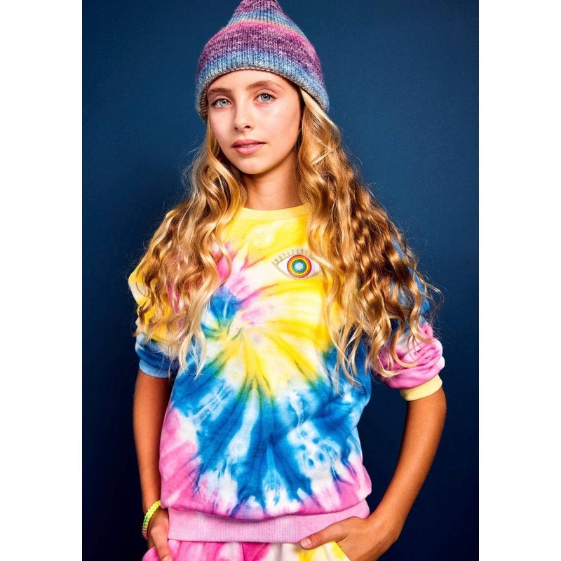 Description:Vibrant tie-dye two-piece set featuring a long-sleeve crewneck top and matching joggers.Accented with embroidered evil eye and rainbow cloud patches for a unique and playful touch.Perfect for casual days or making a colorful statement on the go