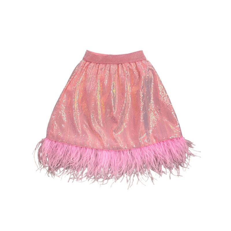 - Add sparkle to any outfit with this skirt, featuring eye-catching pink sequins and a whimsical feather trim.