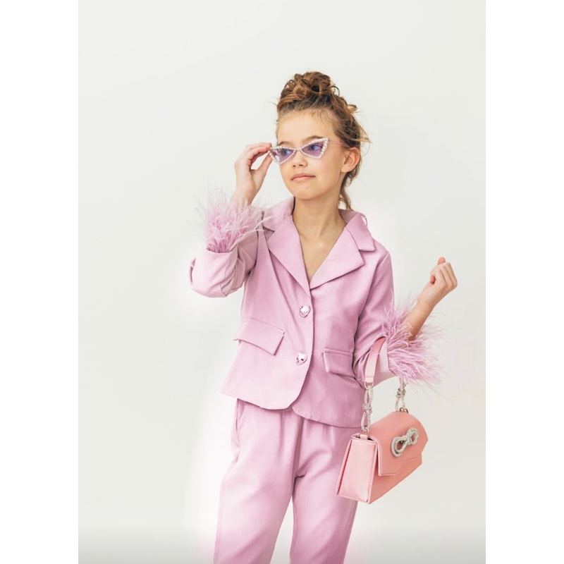 - Elevate your style with this chic Feather Trims Suit, featuring a tailored blazer adorned with playful feather cuffs.