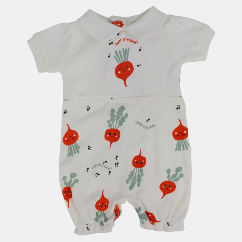 A cute and comfy romper designed for little girls, featuring a fun "Feel the Beet" print that adds a playful touch. Made from 100% soft cotton, this romper is perfect for keeping your baby cool and comfortable throughout the day.Product details:100% breath
