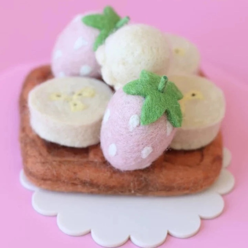 1 x Waffle 10cm3 x banana slices 4.5cm2 x Pink strawberries1 x scoop of vanilla bean ice cream 4cmThesehave been designedby Juni Moon and Handmade with love using pure New Zealand merino woolby a wonderfully talented team of Artisansin Nepal.WARNING:Produc
