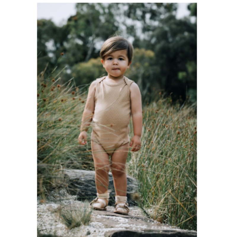 Our sleeveless body suit is knitted into a classic Jersey two tone stripes, which is soft and breathable. Simple dome snaps help with quick nappy change.Made from 100% chemical-free Organic Natural Colour CottonJersey two tone striped fabricContrast Neck &