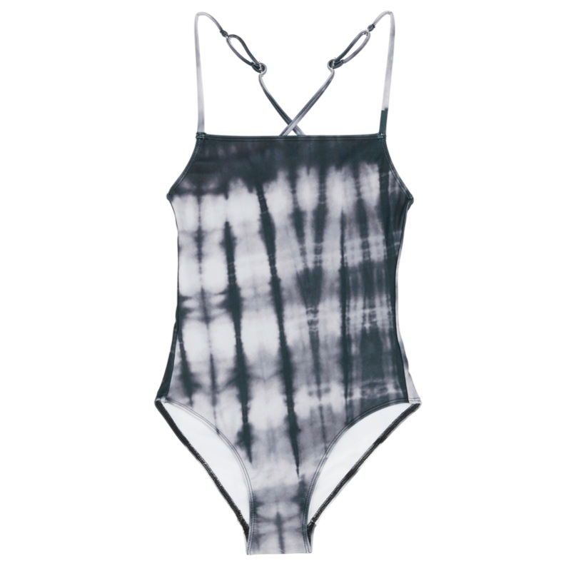 finger in the nose coco swimsuit in black tie dye. features top stitched edges, and adjustable thin straps that cross in the back.