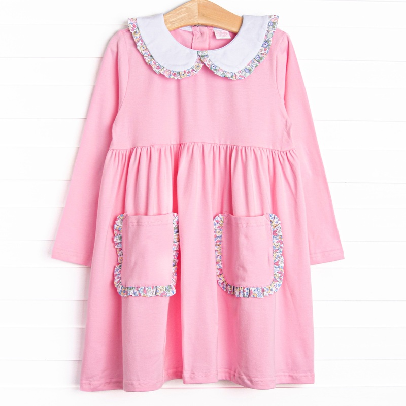 Fabulous Finley Florals! This dress features the prettiest pink material. a peter pan collar, and front pockets. This dress is just too cute!