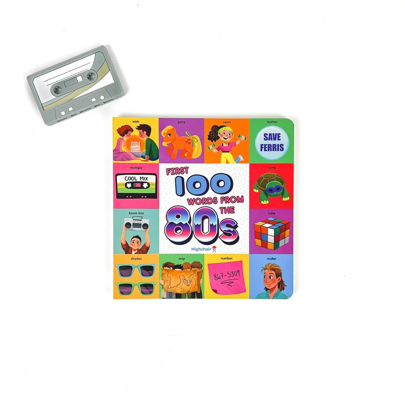 This hysterical book of first words by Sara Miller is a pure 80s throwback.Featuring 100words and phrases from adecade unlike any other, bright and playful illustrations, and 5 pop culture categories that are"totally rad!" Little ones will learn all-import