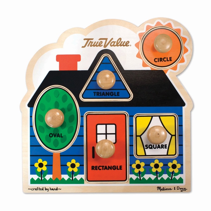 This extra thick wooden puzzle is perfect for beginners. The easily grasped wooden knob lifts shaped pieces easily to show colorful matching pictures beneath. Inspires shape recognition, visual perception, and hand-eye coordination.