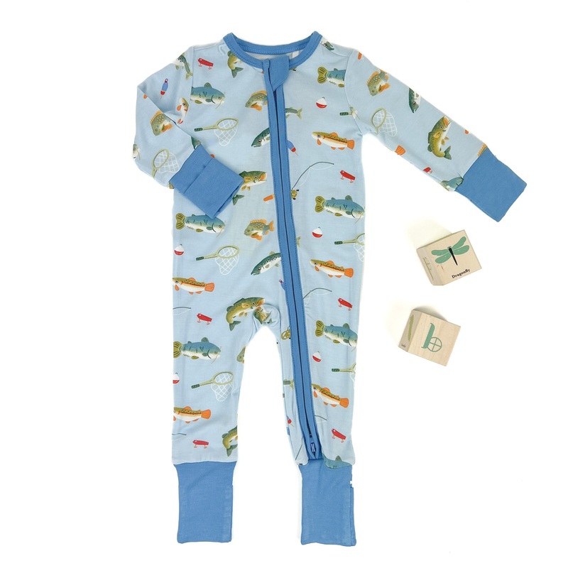 This sweet fishing-inspired romper is both cozy and charming. The convenient two-way zipper makes dressing your child a breeze. The included fold-over cuffs in sizes 0-3 months up to 12-18 months are perfect for preventing scratches from tiny fingernails, and the added fold-over feet cuffs are an extra perk!