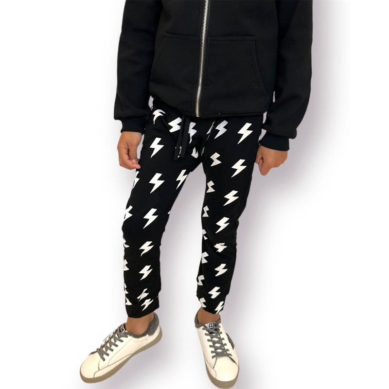 - Eye-catching black joggers adorned with bold lightning bolt prints.