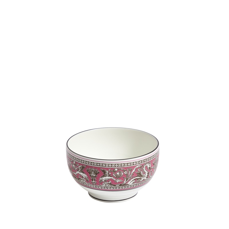 For over 260 years, Wedgwood has produced timeless, eclectic stoneware and china that has graced the tabletops of kings, queens, and some of the finest dining rooms in the world. From its factory inBarlaston, England, the brands signature dishware and household items are thrown, modeled, and decorated by artisans who spend a lifetime mastering their craft. First introduced in 1874, the Florentine collection has mythical creatures roaming amidst fantastic flora in delicately hand-rendered motifs set against the clarity of white, fine bone china. The Florentine Fuchsia Rice Bowl is ideal for a refined meal and tablescape.