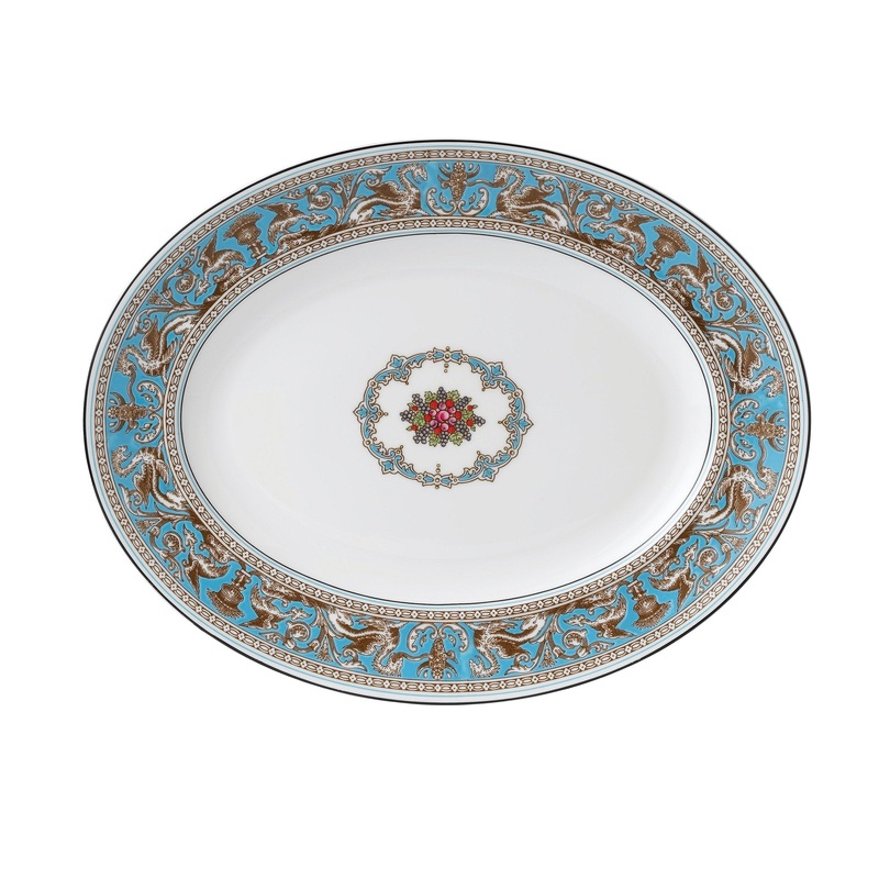 For over 260 years, Wedgwood has produced timeless, eclectic stoneware and china that has graced the tabletops of kings, queens, and some of the finest dining rooms in the world. From its factory inBarlaston, England, the brands signature dishware and household items are thrown, modeled and decorated by artisans who spend a lifetime mastering their craft. First introduced in 1931, the Florentine collection hasmythical creatures roaming amidst fantastic flora indelicately hand-rendered motifs set against the clarity of white, fine bone china. The Florentine Turquoise Oval Platter 13.75″ is ideal for serving larger mains: steak Florentine, pastas, large salads, and more.
