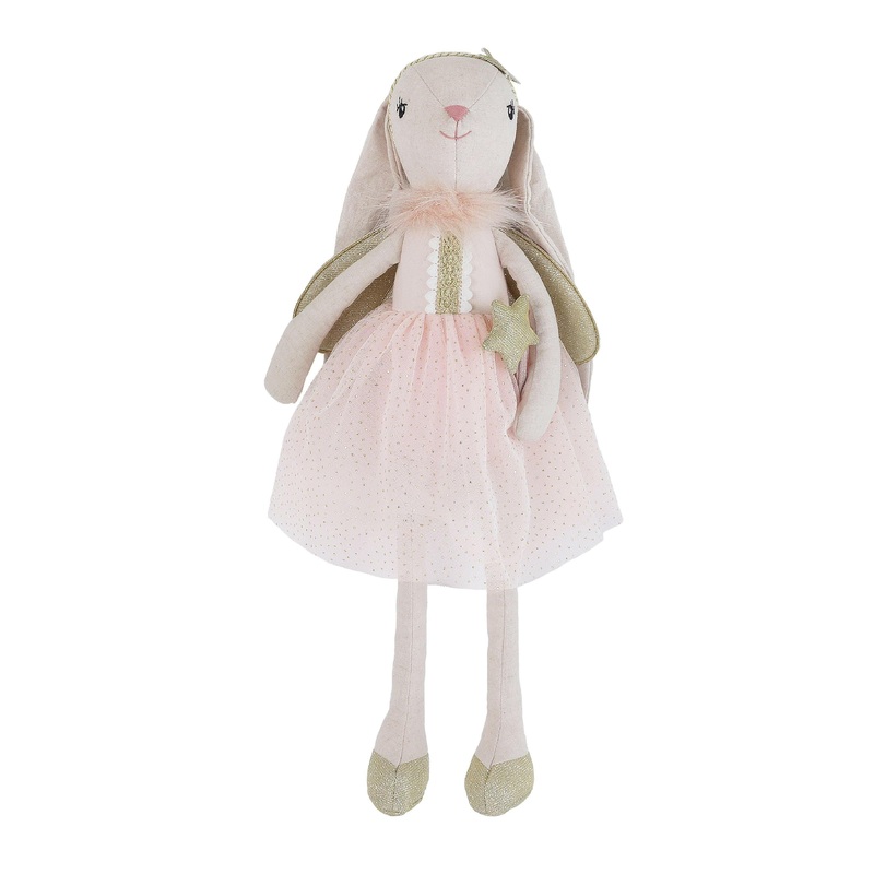 Poof! Flossie bunny fairy doll has arrived to bring magic to the Easter season. And this bunny soft doll creates quite an entrance with her golden fairy wings, sparkly wand, and one-of-a-kind tulle dress detailed with gold and white trim. Her larger size makes this fairy doll a childs perfect companionshes ready to glide along on any adventure. An an Easter gift or just because I love you gift, our bunny soft doll is the golden carrot.