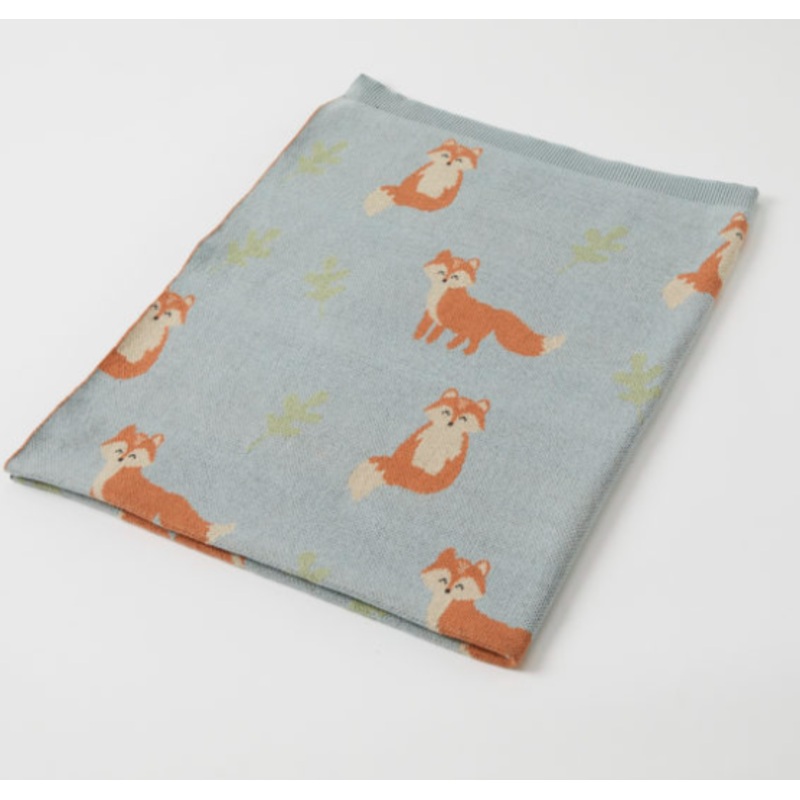 Soft knit blanket in agrey with the sweetest all over fox print. Super snug and warm.