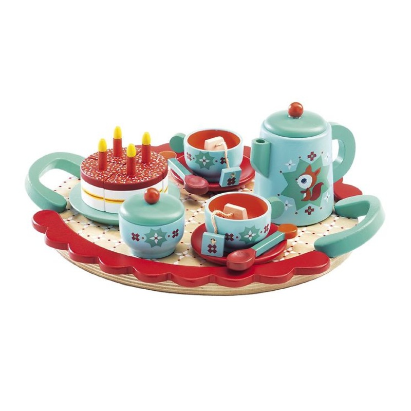 An adorable wooden tea set for birthday celebrations and enjoying tea with friends.An elegant and adorable wooden tea set.Comes on a wooden tray with 2 handles.A role-play game so little ones can have fun being grown-ups!Contents: 1 tray, 2 cups, 2 saucers