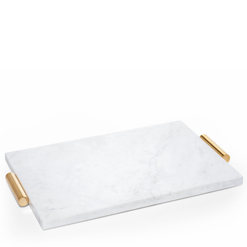Minimal and sophisticated, this beautiful cheese board in sleek white marble (accentuated with tubular brass handles) is a stylish addition to a tabletop. A classic piece, it is hugely versatile, working perfectly for everyday use as well as for entertaini