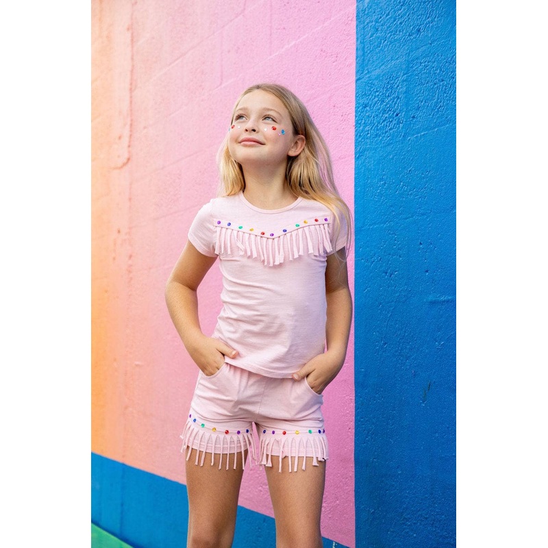 - Two-piece pastel pink set with fun fringe details and rainbow gem embellishments.