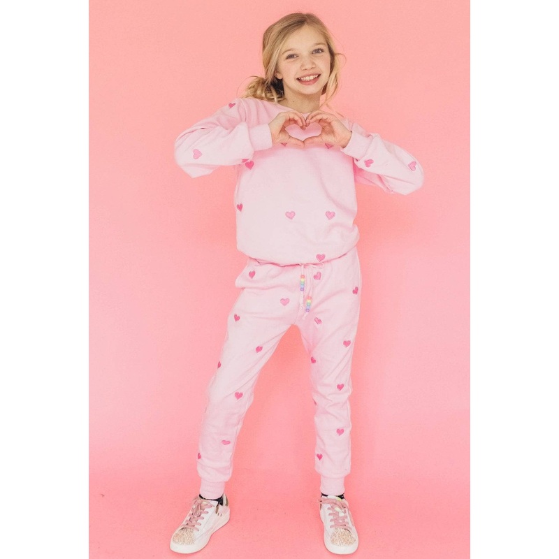 - Adorable and comfy jogger set featuring an all-over pink heart print, perfect for girls who love sweet, playful designs.
