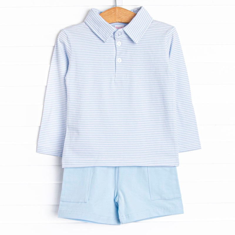 Your little one is ready for a Fun Day Out! This set features a blue striped polo shirt and blue knit shorts. This is the perfect basic for Fall!