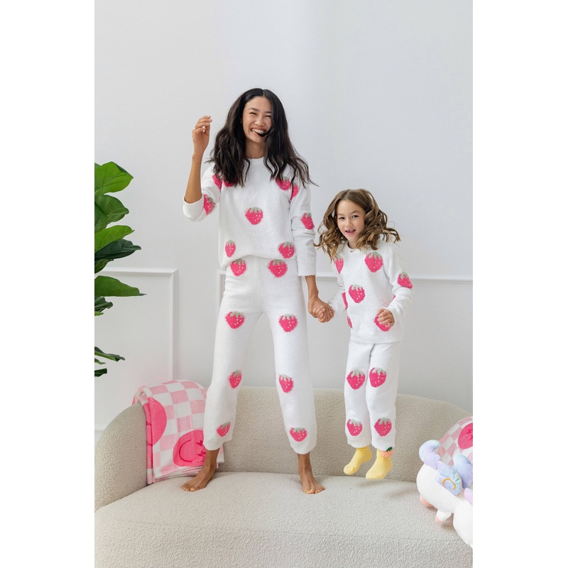 Description:Adorable two-piece lounge set featuring a fuzzy knit sweater and joggers with allover pink strawberry pattern.Super soft and cozy fabric perfect for lounging, playtime, or travel days.Relaxed fit with stretch waist and cuffed hems for ultimate