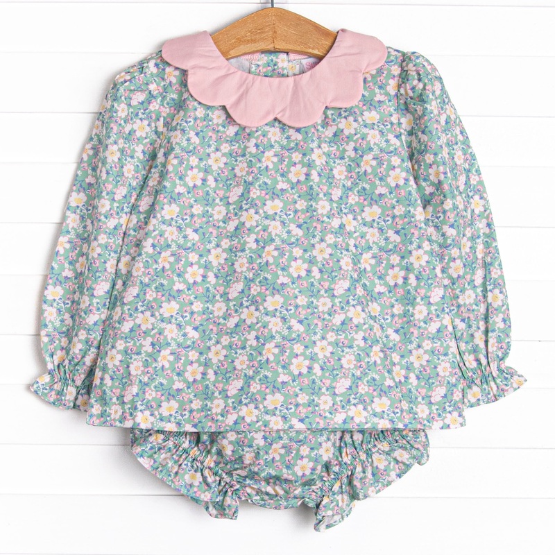 She will look gorgeous in the Gardenia Garden! This set features a green floral print, a pink petal collar, and a matching diaper cover. Your little flower will bloom in this set!