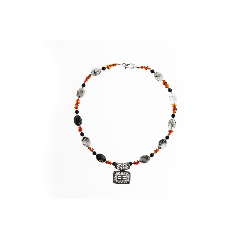 Approximately 17" wine garnet, storm gray quartz, and ebony agate with sterling silver accents and filigreed pendent. Hook and eye claspA stunning necklace of wine red garnets, storm quartz, and ebony agate with a gorgeous silver filigreed pendant, this is