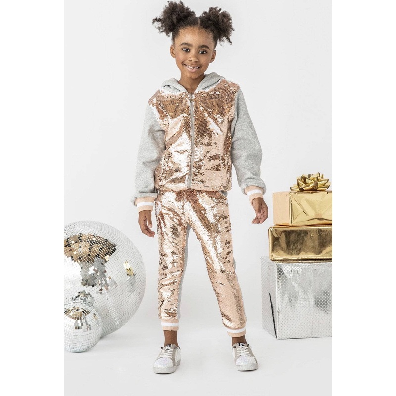 Description:Golden sequin joggersSoft fleeceHas an adorable matching jacketMaterial & Care:Hand wash recommendedDry clean