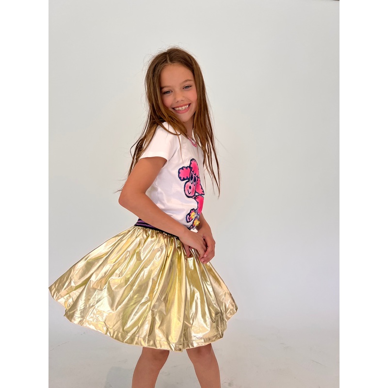 Description:Turn up the shimmer in the dazzling Goldie Foil Skirta radiant metallic piece perfect for parties, photos, and everyday sparkle.Made with a soft gold foil finish that glows with every twirl.Features a comfy elastic waistband with a glittery con