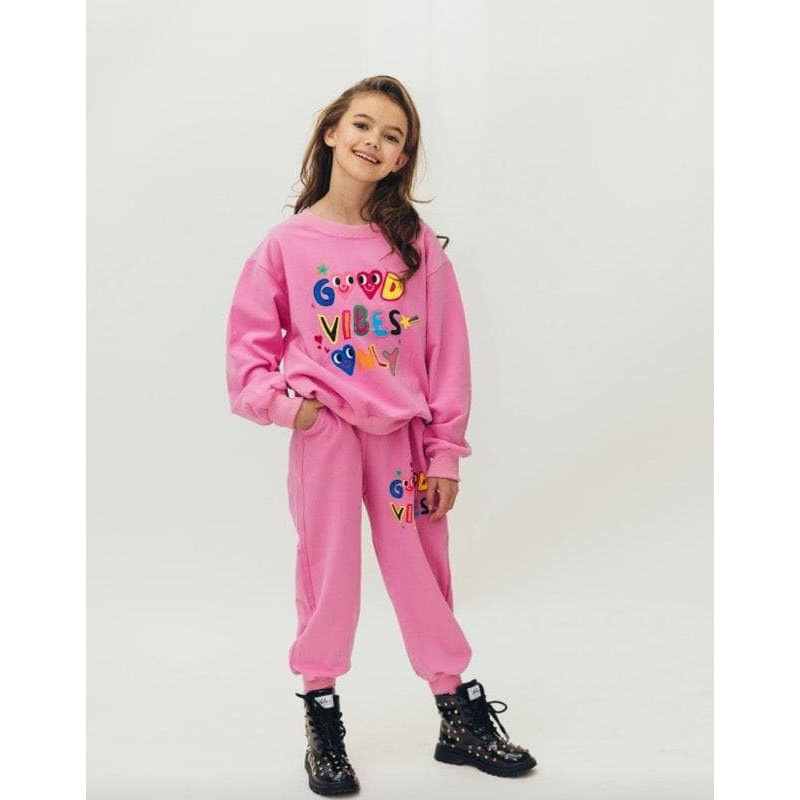 Description:Bright and playful pink matching set featuring a fun "Good Vibes Only" design.Cozy sweatshirt with a relaxed fit and ribbed cuffs for ultimate comfort.Matching joggers with a soft elastic waistband for a perfect fit.Eye-catching multicolored te