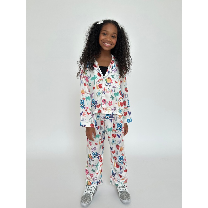- Infuse your downtime with cheerful vibes in this vibrant two-piece silky set featuring playful icons like hearts, cherries, suns, and uplifting phrases.