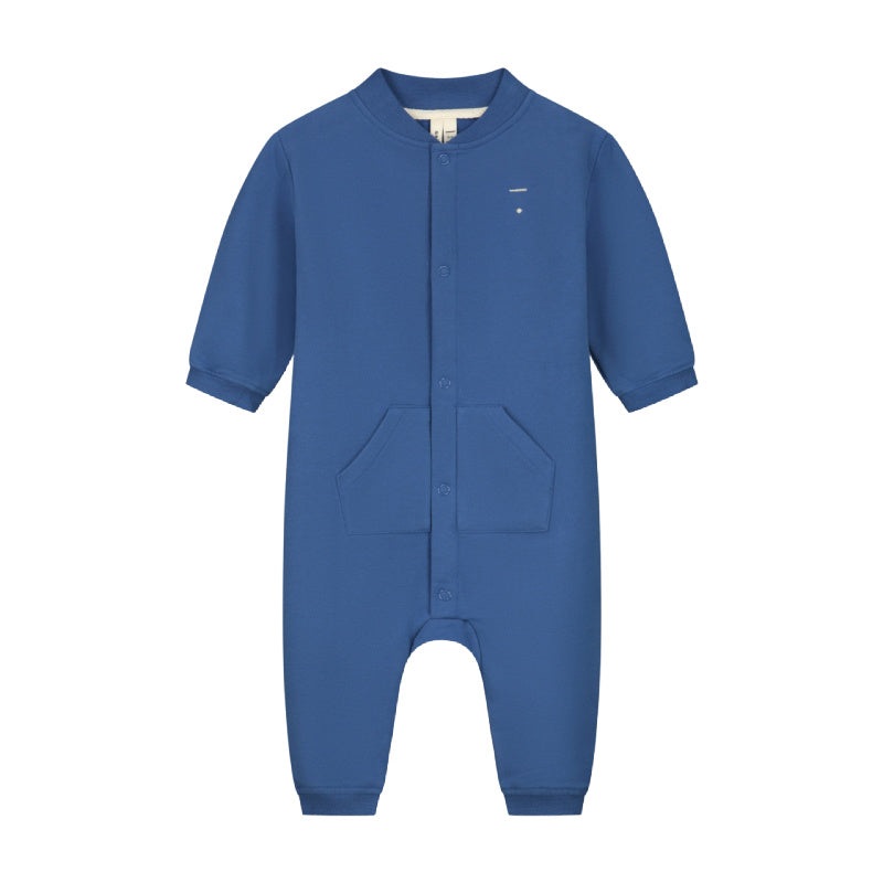 gray labelversatile and warming suit features a round-neck and snap buttons on the front for easy dressing. it has a kangaroo pocket on the front and rich ribbed details in the neck and cuffs. made from the softest 100% organic cotton fabric with a little elastane.