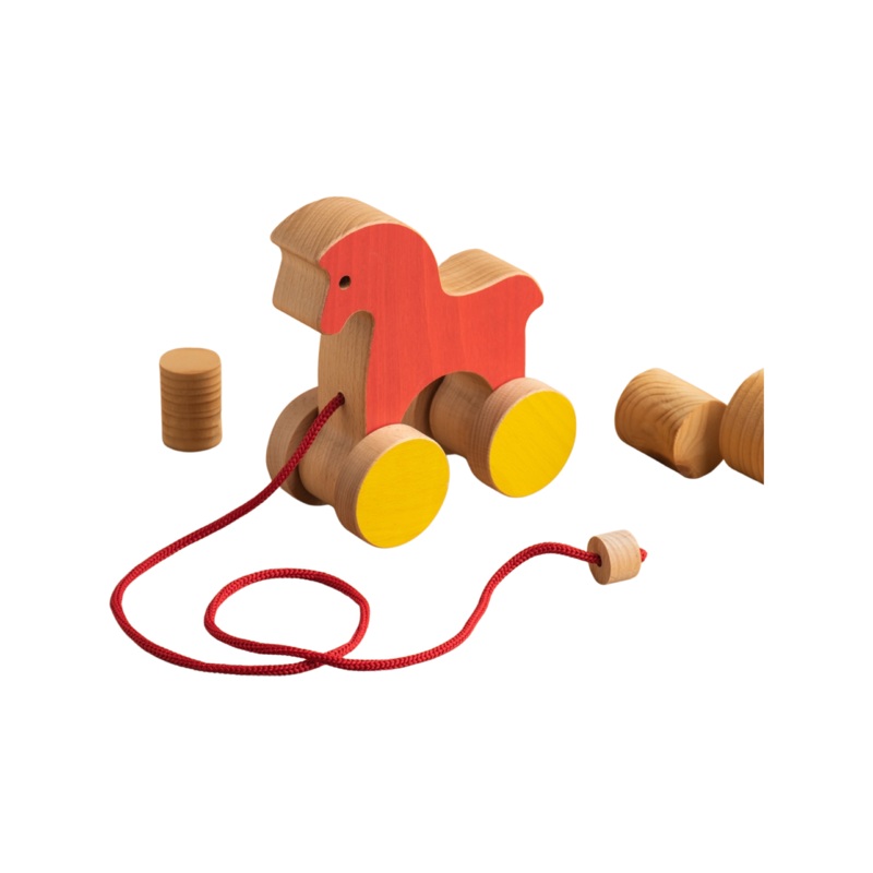 Pull on the red string and the wooden horse toy will follow you in the most exciting stories and adventures. A cheerful push & pull toy inspired by the story of the Trojan Horse made with vivid colors perfect for ready-to-walk young explores in their first steps into a world of entertainment and joy.