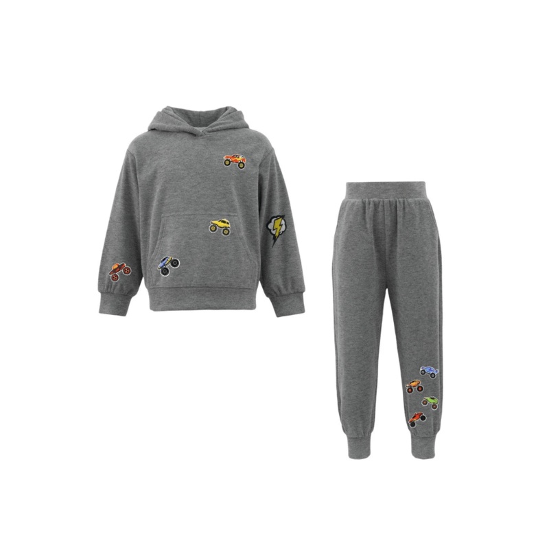 Description:Fun and sporty matching set featuring colorful race car and lightning bolt patchesSoft fleece hoodie with ribbed cuffs and cozy jogger pants with elastic waistbandA perfect everyday outfit for little car lovers on the moveMaterial & Care:Fabric