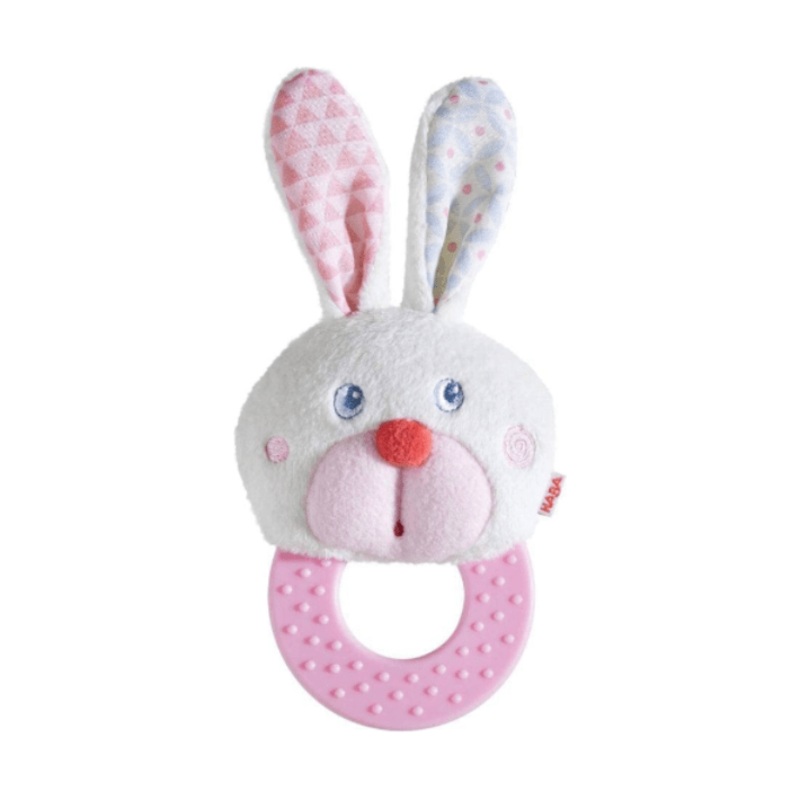 Chomp Champ Bunny with it's enchanting embroidered facial features is sure to be a steady companion for baby long after the Easter basket is put away. Teething babies will instinctively reach out to grasp, explore and teethe on this adorable versatile toy,