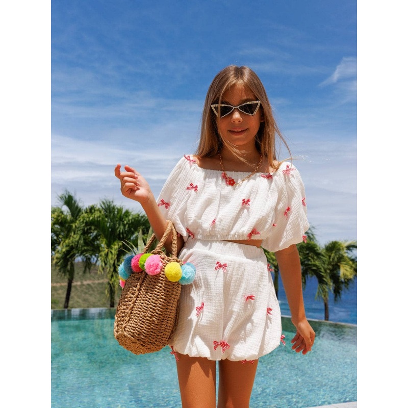Description:Charming two-piece set with puff sleeves and playful red gingham bow details throughoutFeatures a smocked neckline and waistband for a comfortable yet stylish fitBubble-style silhouette adds volume and flair, perfect for special outings or sunn