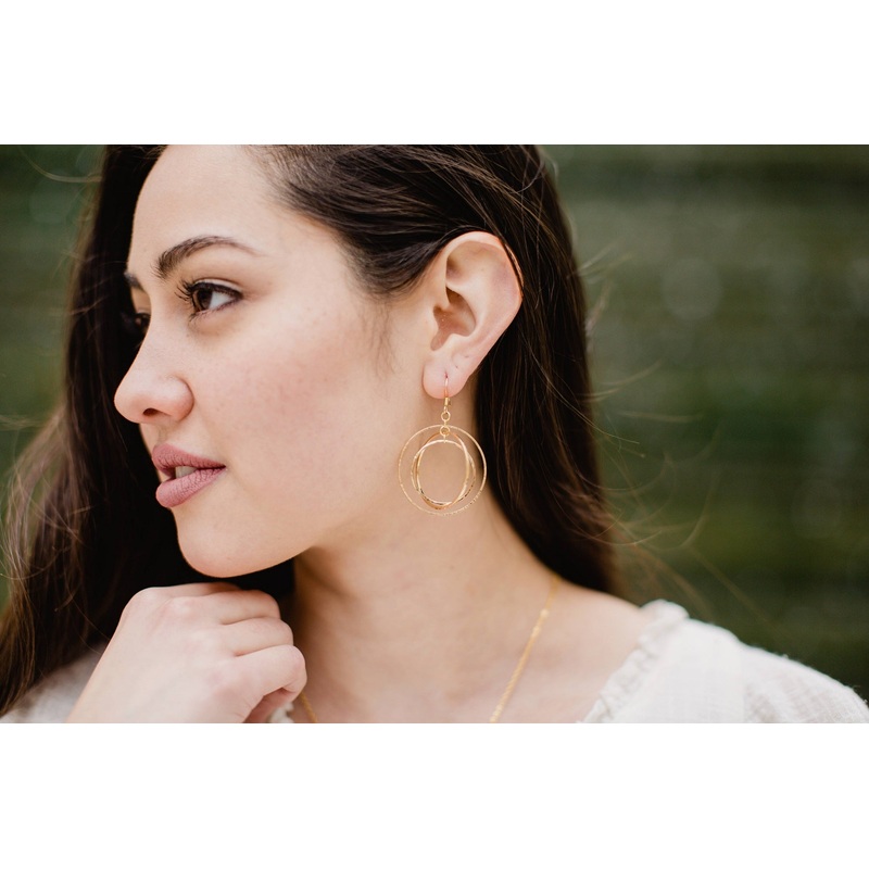 These intricate Hammered Orb Earrings display three hammered gold-plated circles. The earrings themselves measure at a 1.5" diameter. Support at-risk women from Michigan when you purchase these delicate earrings!