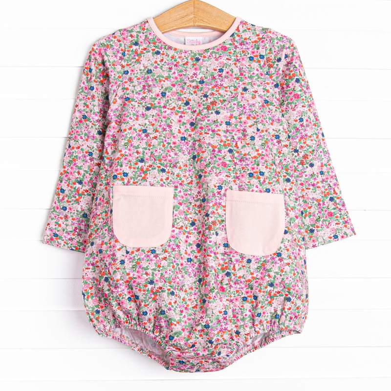 Darling Hand-Painted Petals! This bubble features a pink floral print, pink front pockets, and pink trim. She will have fun in florals!SIZE GUIDE95% Cotton / 5% Spandex*Sibling Match Available