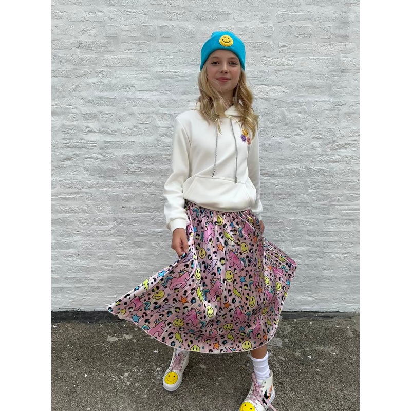 - A vibrant pleated midi skirt adorned with a playful pattern of smiley faces, unicorns, stars, and colorful prints for a cheerful statement look.