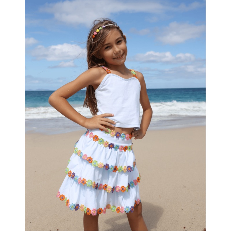DescriptionCheerful set featuring colorful floral embroidery on a light blue background.Includes a sleeveless crop top with vibrant floral straps and a matching tiered skirt.Top offers a comfortable fit with charming floral details on the straps.Skirt feat