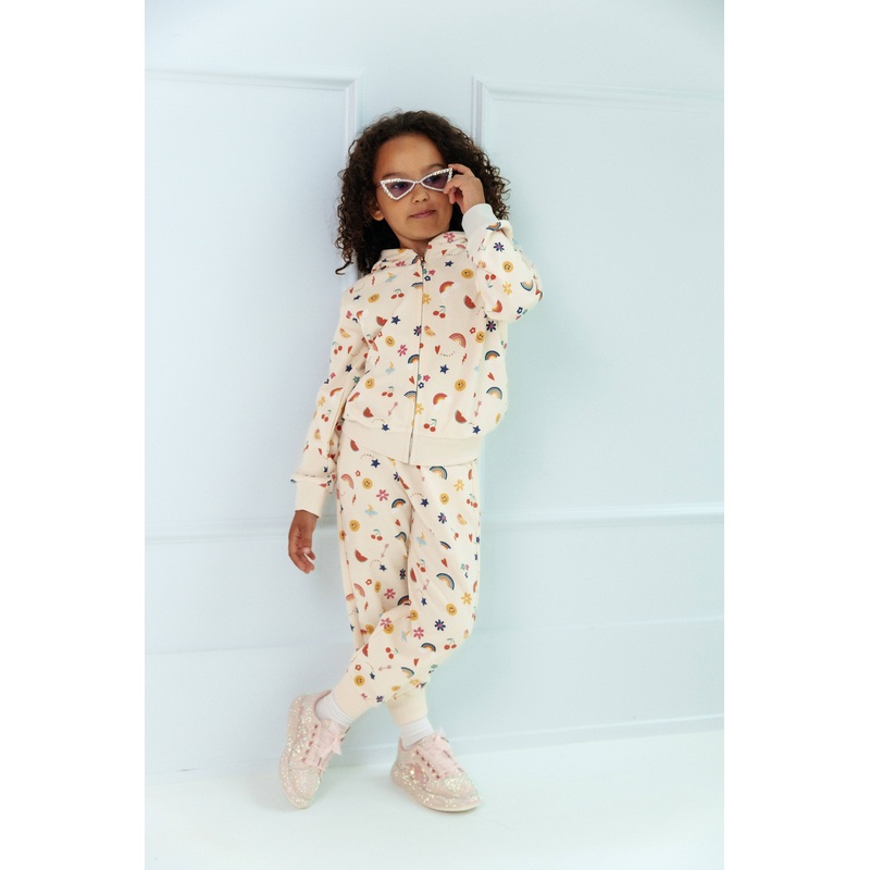 DescriptionAdorned with cheerful doodle patterns in a colorful palette, this jogger set brings vibrant energy to any casual day.Hoodie with a full zip and relaxed joggers ensure all-day comfort without compromising on style.Ideal for playful outings or add